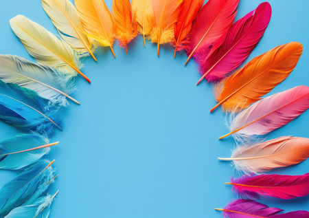 Colorful feathers arranged in a circular pattern on a bright blue background, creating a vibrant and artistic composition. Decorative and creative concept.
