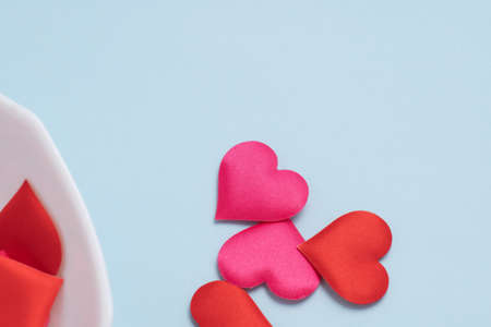Valentine day greeting concept hearts decoration on bright background top view, copy space. flat lay