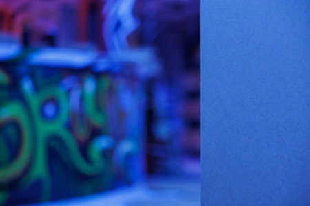 Empty abandoned building with purple neon lights, spray paint artwork glowing under fluorescent lights in neglected rusty place. Destroyed grungy space with bright blue glow, ruined warehouse.