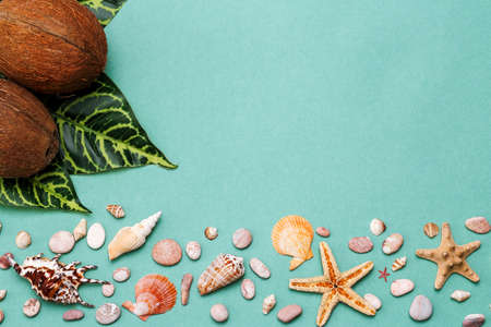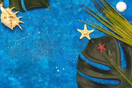Travel and vacation concept. Summer 2020 background with monstera leaf, seashells and marine symbols. Nautical background