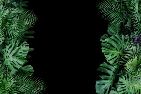 Mix of tropical leaves on green and black backgrounds. Place for text.
