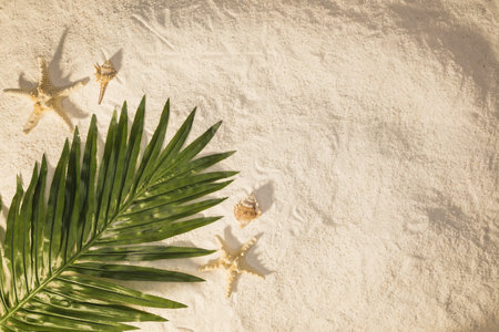 Flat lay composition with starfish, sand and palm leaves on a light background