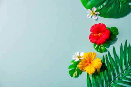 Tropical background. Palm and monstera leaves on yellow blue background. Flatlay, top view, minimal layout, summer concept