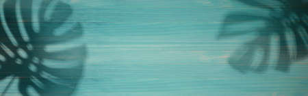 Green tropical leaves on blue grunge background with space for text. Banner design