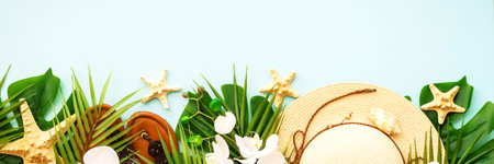 palm leaf, straw hat ,starfish Summer background Top view Banner Copy space