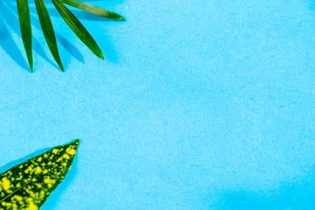 Summer flat lay frame with fresh tropical leaves on blue background with copy space