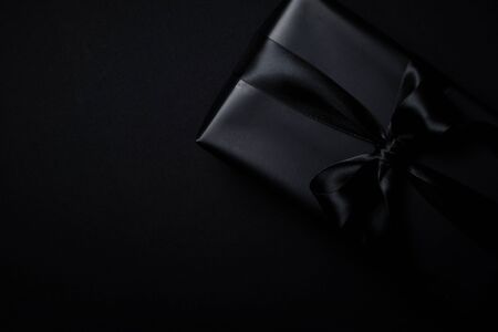 Black Friday Sale concept, Top view of gift box wrapped black paper and black bow ribbon press, studio shot on and having red ribbon across a dark background