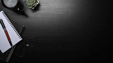 Top view of black table with copy space, eyeglasses, supplies and coffee cup in home office room