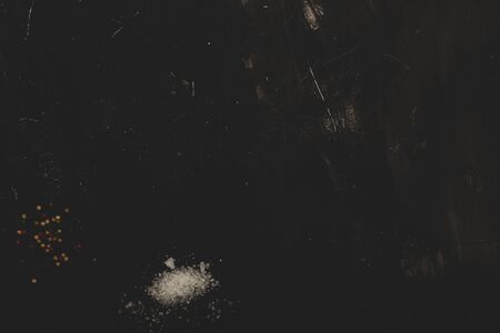 dark background with scattered flecks of salt. food spices. rough textured surface. free space concept