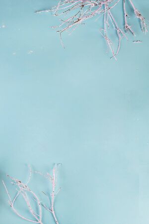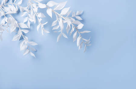 Blue wall and abstract plant. Minimal abstract background for product presentation. Spring and winter