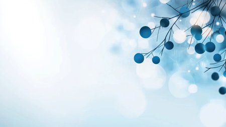 A close-up shot of blue berries on a branch, set against a soft, light blue background with bokeh effects, creating a serene and natural aesthetic.