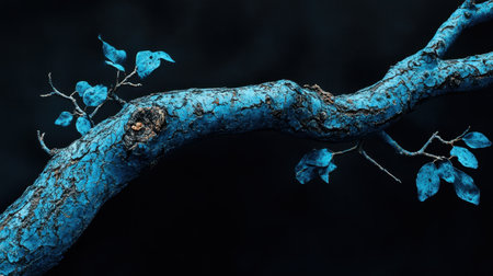 A striking blue tree branch isolated in space, with detailed textures of bark and leaves, creating a surreal yet natural visual