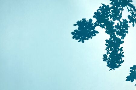 Tree branches and flowering plants and shadows on a blue wall background. Flat lay. Minimal concept of abstract natural summer texture Selective focus