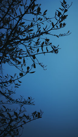 A close-up view displays tree branches against a hazy, blue backdrop. The branches exhibit a dark silhouette, while the background suggests a foggy atmosphere. The composition emphasizes textures and lines, potentially suitable for various design projects or visual content requiring a serene feel, or nature-related themes.