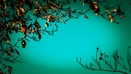 Branches of autumnal trees as nature background. Golden autumn, copy space. Abstract filter toned