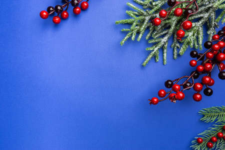 Christmas holidays composition with christmas decorations, red berries and thuja branches on blue background with copy space, top view