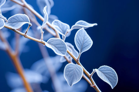 A delicate branch displays vibrant blue leaves, creating a striking contrast against a light backdrop. This composition captures nature's elegance in a bold, artistic way.