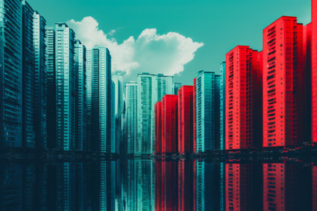 A photo of a city skyline with a blue sky and clouds. The buildings are tall and red, and the sky is clear. The photo has a sense of depth and perspective