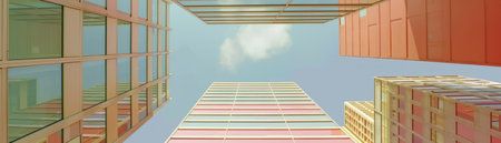An upward perspective captures tall skyscrapers against a clear sky. The image showcases the repetitive facades of the buildings and emphasizes their height. The color palette consists of neutral tones, possibly depicting a cityscape environment. Suitable for a range of commercial applications, this image conveys urban themes.