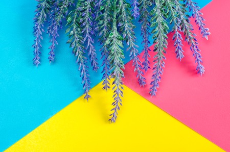 Bouquet of lavender lies on colorful blue yellow pink background. Flat lay spring backdrop with copy space