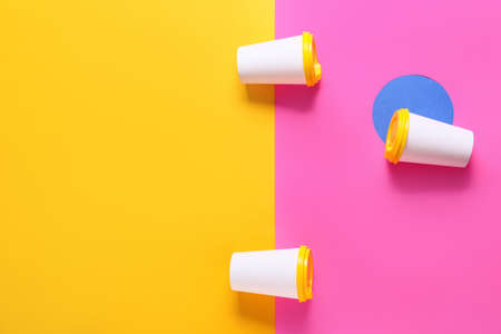 Color papers geometry flat composition background with pink, purple, violet yellow and blue tones