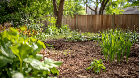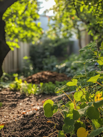 In a flourishing garden, healthy plants thrive nearby a compost pile, enhancing the soil's richness and sustainability.