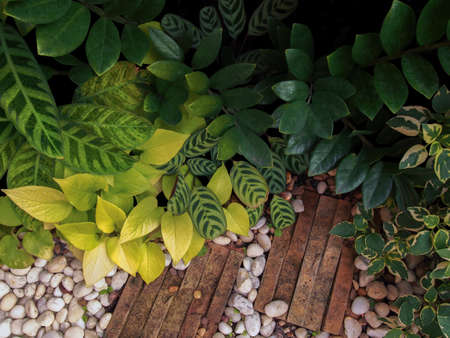 Tropical garden design with stone path and interiorscape plants such as Pothos ivy, zebra plant, Calathea, Zamioculcas (Zanzibar Gem or ZZ Plant), and pseuderanthemum or false Eranthemum.