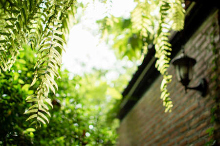 summer abstract nature background with hanging vines at the entrance to the backyard with copy space