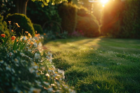 Beautiful manicured lawn and flowerbed with deciduous shrubs on private plot and track to house against backlit bright warm sunset evening light on background. Soft focusing in foreground