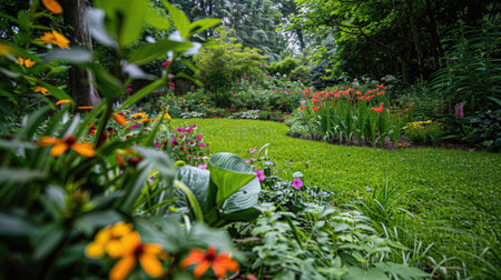 A vibrant garden landscape showcasing colorful flowers scattered across lush green grass. This serene scene captures the beauty of nature, perfect for evoking tranquility and outdoor aesthetics.