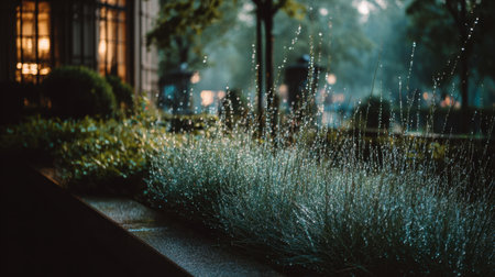 Early morning light illuminating dew-covered plants in a peaceful hotel garden