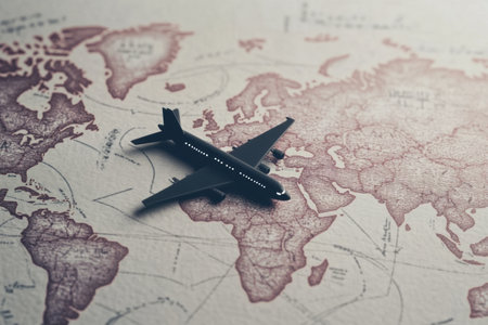 Close-up of a model airplane flying over a detailed, glowing map of the world, showcasing global travel and connectivity.