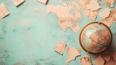 A vintage globe is positioned on a textured turquoise surface scattered with torn map fragments, inviting exploration and adventure.