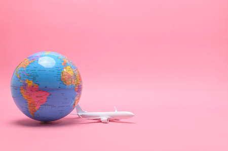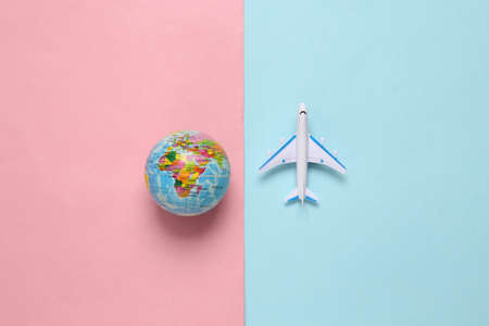 Toy passenger plane and globe on blue pink background. Voyage, Travel, summer vacation concept. top view