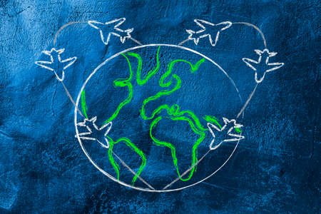 hand drawn traveling around the world by air plane on wood background