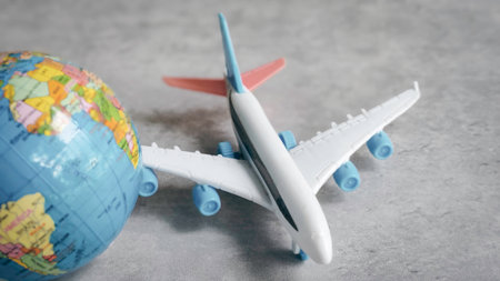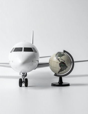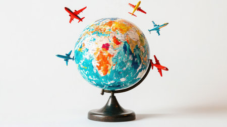 A globe with toy airplanes circling it in flight paths, evoking the excitement of worldwide travel, against a bright white background.
