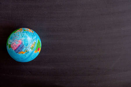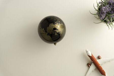 The globe on the table, flat lay and minimal background with copy space, top view