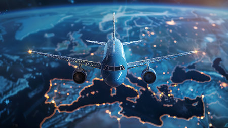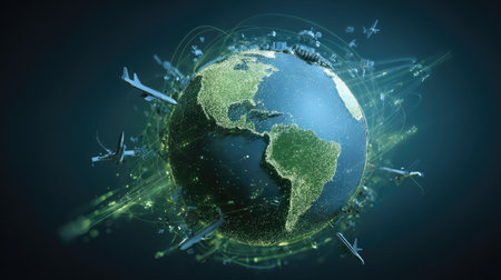 The image depicts planet Earth encircled by numerous airplanes and illuminated digital pathways. The globe presents continents with a vibrant green hue, contrasted against a dark, expansive background. This composition suggests global connectivity, with the potential for use in travel, technology, or international business contexts.
