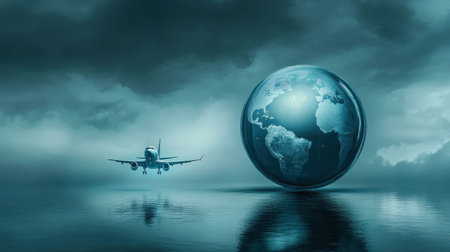 A stunning visual of an airplane flying in a dramatic sky with a globe overlay. The serene water reflects the world, creating an impactful travel atmosphere.