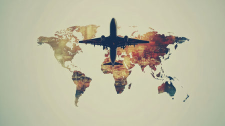 Abstract design Airplane taking off Double exposure world map . Elements of this image furnished by NASA -