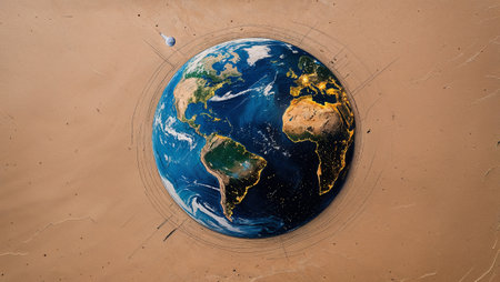 Earth globe rotating in space, showing illuminated cities at night and continents during daytime, with moon orbiting around. Ai generated image
