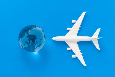 white airplane toy model with global world on blue background in airline business for travel tour international concept