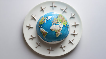 A plate with a miniature globe encircled by tiny airplanes, illustrating the movement and impact of international travel