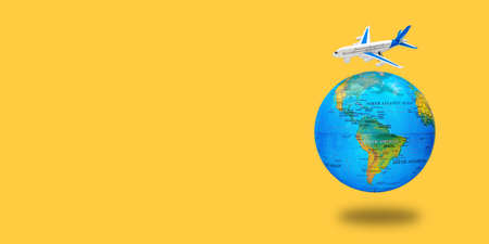 Plastic toy plane on the globe. Flight travel concept. Travel by airplane.