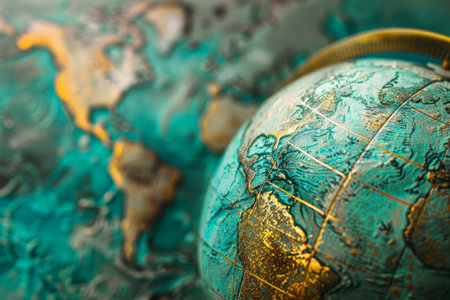 This close-up view captures a detailed blue and gold globe, showcasing the intricate patterns and colors of the Earth. The deep blues and shimmering golds contrast beautifully, highlighting the globes geographical features.