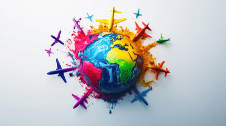 A vibrant globe with playful, colorful airplanes circling it, emphasizing exploration and wanderlust, on a stark white background.