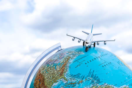 The toy plane on the globe against the sky. Travel concept. Bulgaria, 07.05.2020