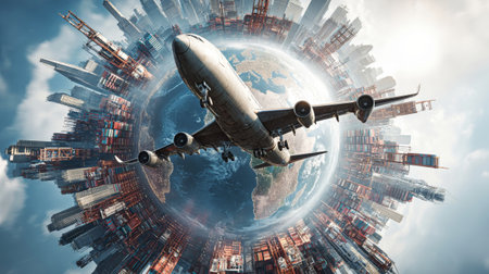 A cargo plane navigates the skies above a detailed world map, showcasing international trade and air transportation against a bustling city skyline.
