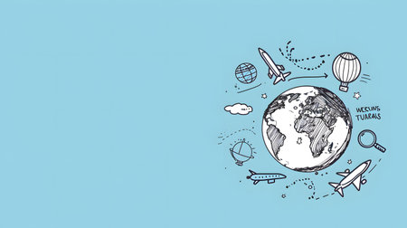 A vibrant image showcases a stylized globe surrounded by travel-related icons. An airplane model is featured, set against a gradient blue background. The composition utilizes vector art and a 3D render, suggesting travel and global connectivity, suitable for promotional materials.