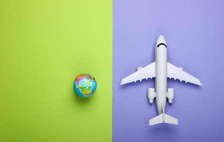 Tourism and travel concept. Emigration. Globe and passenger plane figurine on purple green background. Top view. Flat lay